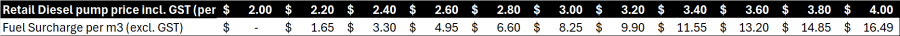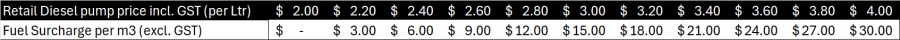 Based on the current diesel pump price, our fuel surcharge from the 30th March 2026 will be $9.90 per m³. The below table gives you an idea of how the surcharge will work based on National diesel pump pricing (published by Envisory), to allow you to plan as best as possible whilst we navigate this situation.